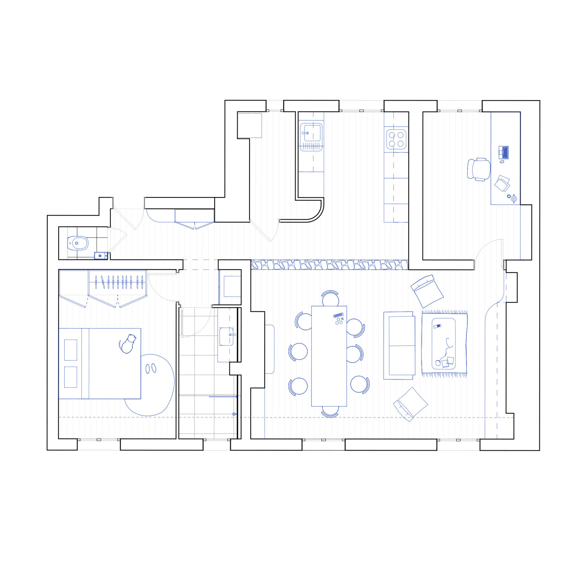 Le projet a pour but la réorganisation de l’ensemble. Pour ce faire, un mur porteur a été déposé de sorte à libérer un espace adjacent au séjour et de profiter d’une grande pièce de vie traversante dans laquelle la cuisine prend place.